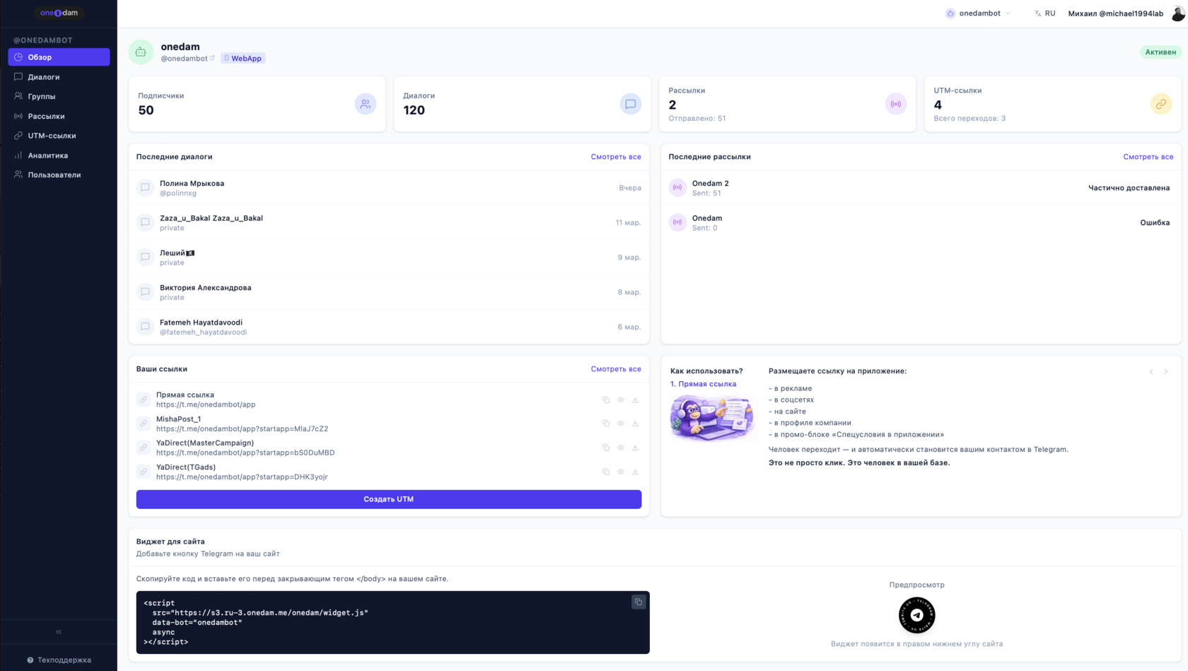 Отвечайте пользователям прямо внутри системы. Видите, кто уже заходил в приложение, подключаете менеджеров и не теряете входящий трафик.